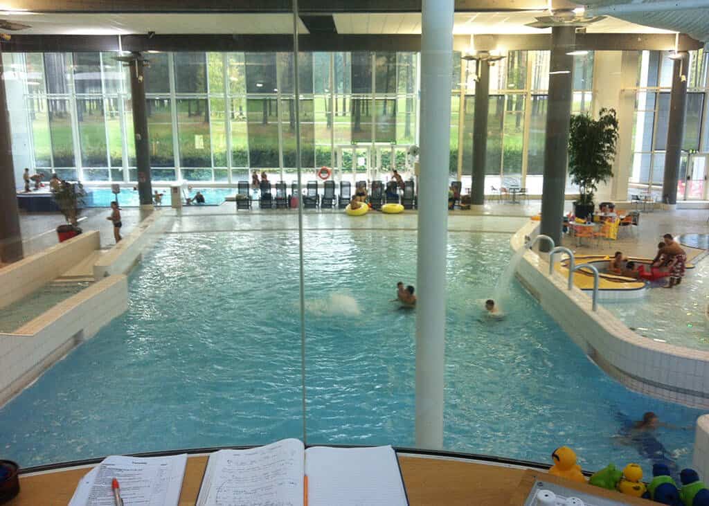 A multi-pool aquatic center with a 25m lap pool, a play area and a very small therapy pool (6.50 x 4.50m). SwimEye has overcome challenging light and shade conditions in these swimming pools.